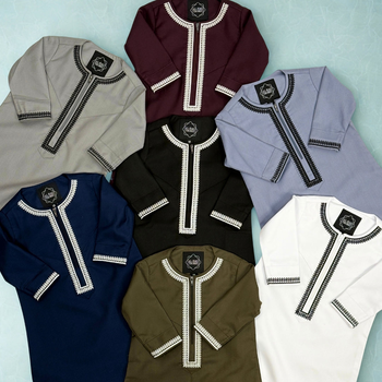 Discover our Luxury Omani Thobes for Kids, crafted from premium fabrics. Featuring intricate embroidery, a structured Omani collar, a hidden zip, and a detachable tassel, these thobes perfectly match our mens Omani Collection.