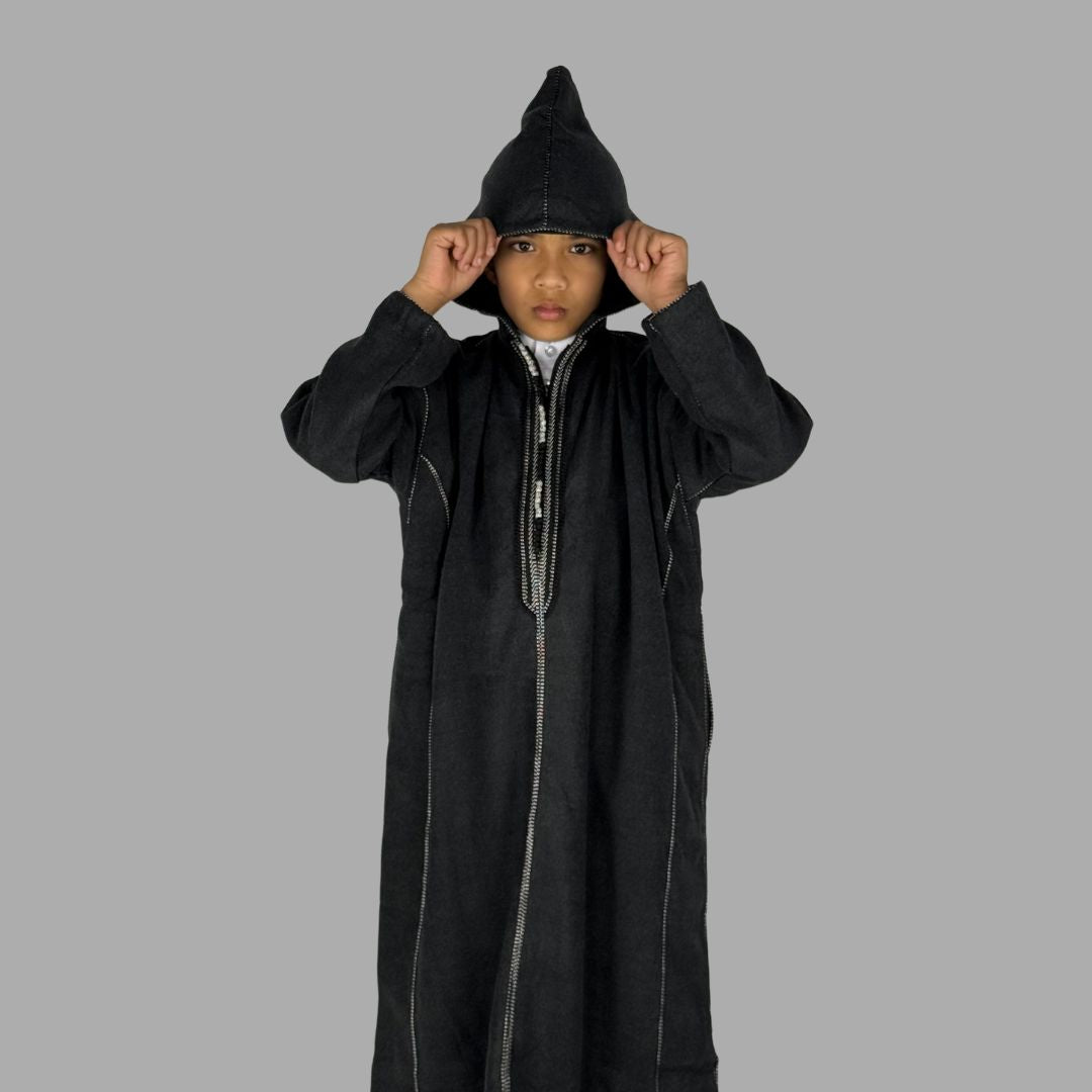 Boys Premium Ash Black Hooded Moroccan Thobe